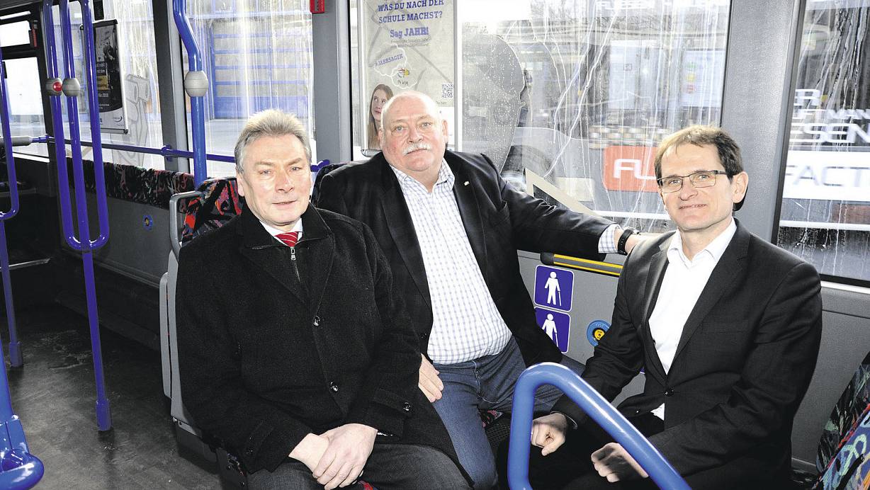 Sind sich einig: (v. l.) Für Padersprinter-Geschäftsführer Peter Bronnenberg, seinen kaufmännischen Leiter Andreas Frank und den stellvertretenden Bürgermeister Dieter Honervogt ist klar, dass ein kostenloser Nahverkehr in Paderborn nicht finanzierbar ist. | © Birger Berbüsse