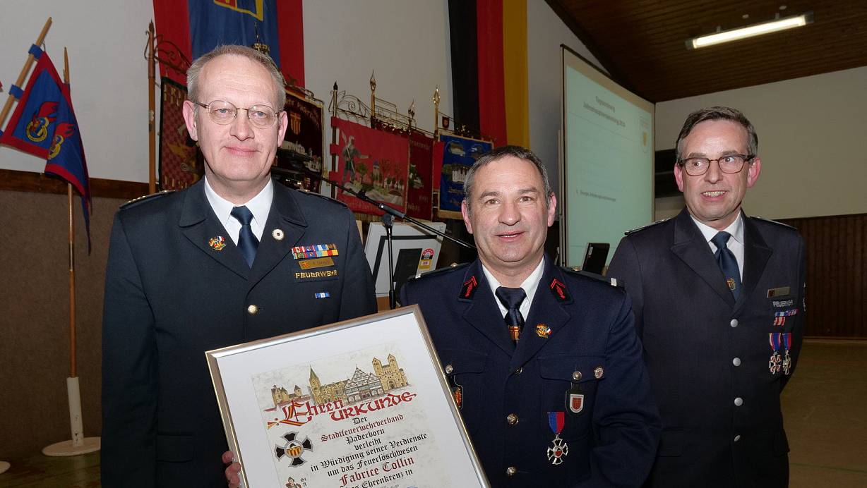 Gelebte Partnerschaft: Fabrice Collin (Mitte) von der Feuerwehr Le Mans erhält von Ralf Schmitz (l.) und Hubertus Henning (r.) das Paderborner Feuerwehr-Ehrenkreuz in Silber. | © Ralph Meyer