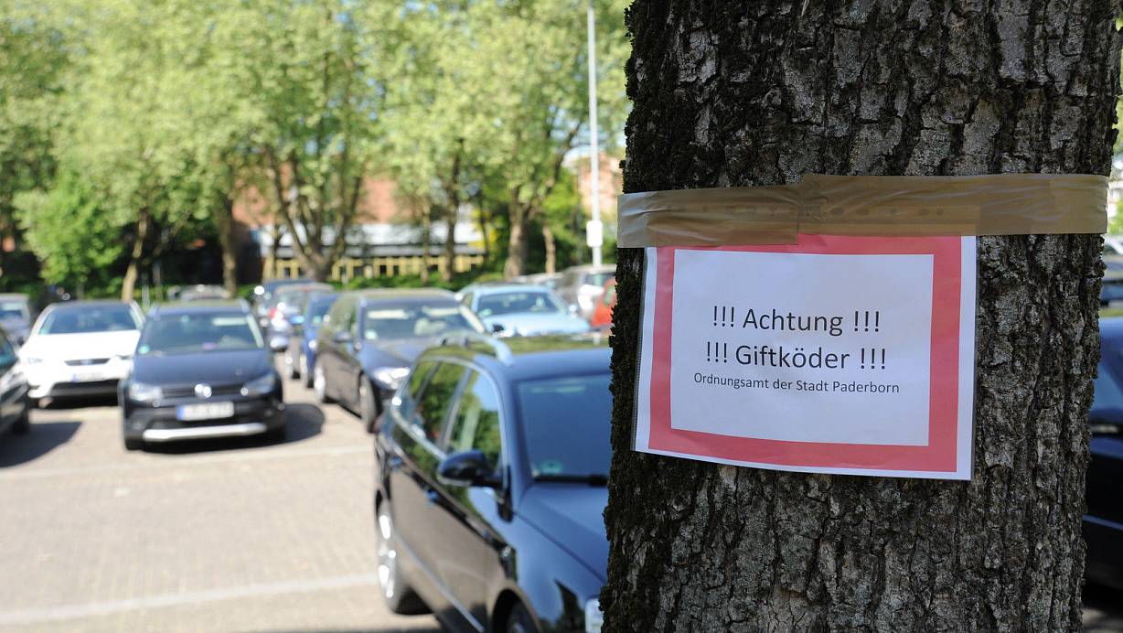 Vorsicht: Das Ordnungsamt machte am Maspernplatz mit einem Schild auf die vermeintlichen Giftköder aufmerksam. Hier sollten Hundehalter ihre Vierbeiner anleinen und nicht aus den Augen lassen. | © Birger Berbüsse