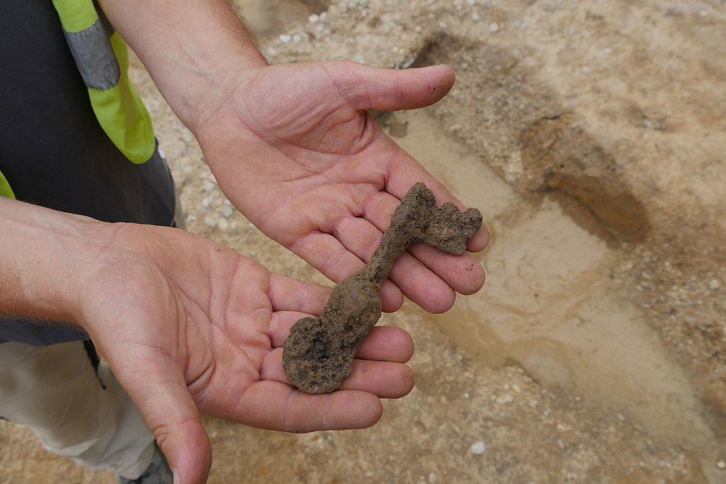 Knapp einen Meter unter dem Asphalt des Schulhofs entdeckten die Archäologen zahlreiche kleinere Gruben und Pfostenlöcher. Diese Reste vergangener Siedlungen sind nur noch als dunkle Verfärbungen im hellen Boden zu erkennen. Die ältesten Spuren stammen aus der Eisenzeit, wie die Archäologen anhand von Keramikscherben feststellen konnten. Bei einigen Gruben handelt es sich um Vorratslager, vor allem für Getreide.