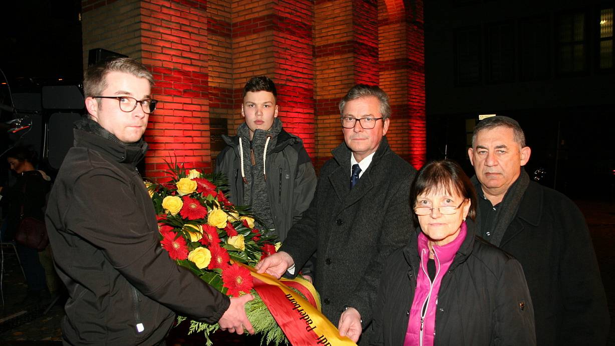 Gedenken: (v.l.) Pascal Neumann und Paul Gruner (beide Auszubildende der Stadt), Bürgermeister Michael Dreier, Monika Schrader-Bewermeier (Gesellschaft für Christlich-Jüdische Zusammenarbeit) und Alexander Kogan (Jüdische Kultusgemeinde Paderborn). | © Katharina Thiel