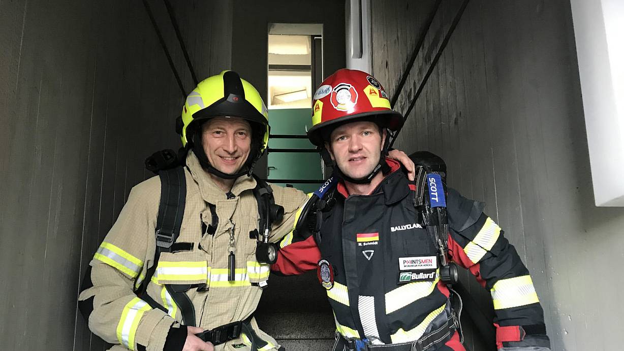 Um sich auf den Tag vorzubereiten, erklimmen die Feuerwehrmänner schon seit einem Jahr die Treppen – anfangs in Sportbekleidung. Beim Training wurde später die Schutzkleidung Stück für Stück ergänzt, bis der Pressluftatmer inklusive Sauerstoffflasche dazukam. Das sind rund 20 Kilogramm zusätzlich.
