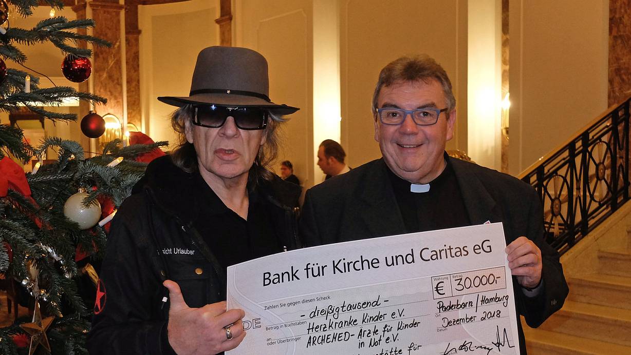 Paderborn. Als besonderes Weihnachtsgeschenk spenden Panikrocker Udo Lindenberg und das Bonifatiuswerk der Katholiken 30.000 Euro an drei soziale Projekte für Frauen und Kinder. Die Spendensumme ist der Erlös aus der Kunstausstellung „Udos 10 Gebote", die das Bonifatiuswerk anlässlich des Katholikentages in der Liebfrauen-Überwasserkirche in Münster gezeigt hatte. Die Vereine „Archemed – Ärzte für Kinder in Not", Möhnesee, und „Herzkranke Kinder" in Münster sowie die Bildungseinrichtung „JACK" für schutzbedürftige Frauen in Berlin werden mit jeweils 10.000 Euro unterstützt. Das Bonifatiuswerk hat seinen Sitz in Paderborn.