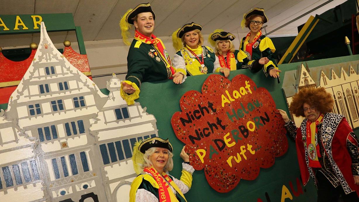 Die meisten Wagen für die Karnevalsparade in Paderborn sind fast fertig. Die Jecken von Hasi Palau stehen schon bereit