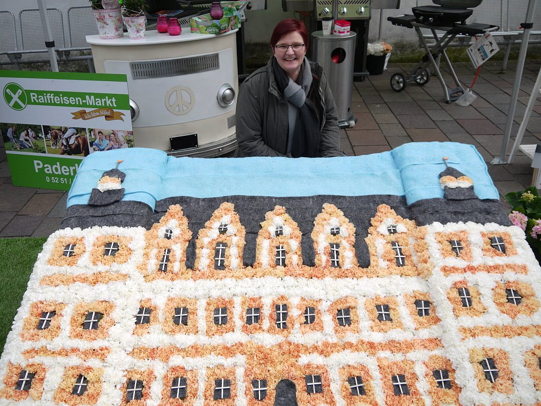Auch vor der Franziskaner-Kirche blieben viele Besucher stehen. Floristin Katja Schmidt vom Raiffaisenmarkt stellte dort aus weißen und orangenen Nelken ein Bild des Neuhäuser Residenzschlosses her. Auch das Rathaus und das Drei-Hasen-Fenster stellte sie in vergangenen Jahren schon aus Blumen zusammen. „Jetzt ist das Schloss Neuhaus an der Reihe, weil der Schloss- und Auenpark in diesem Jahr sein 25-jähriges Jubiläum feiert", erklärt Schmidt.