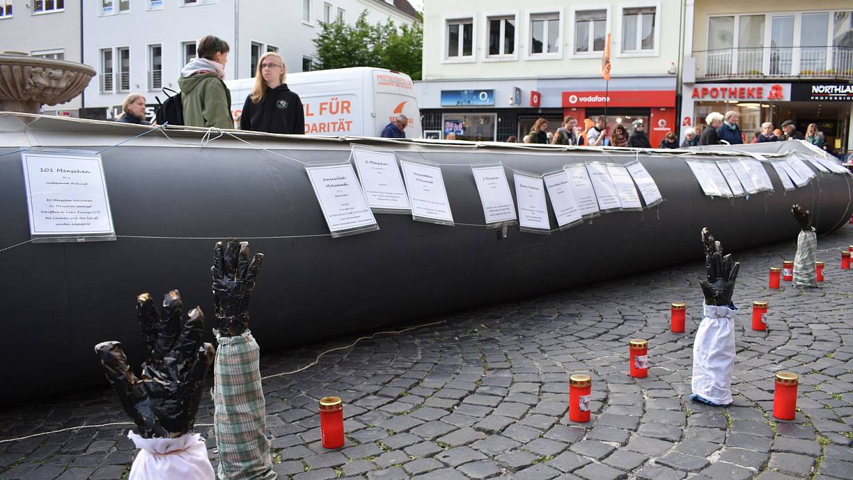 Das Bündnis Seebrücke hat auf dem Rathausplatz ein Flüchtlingsboot aufgebaut, das Menschen über das Mittelmeer befördert hat. | © Svenja Ludwig