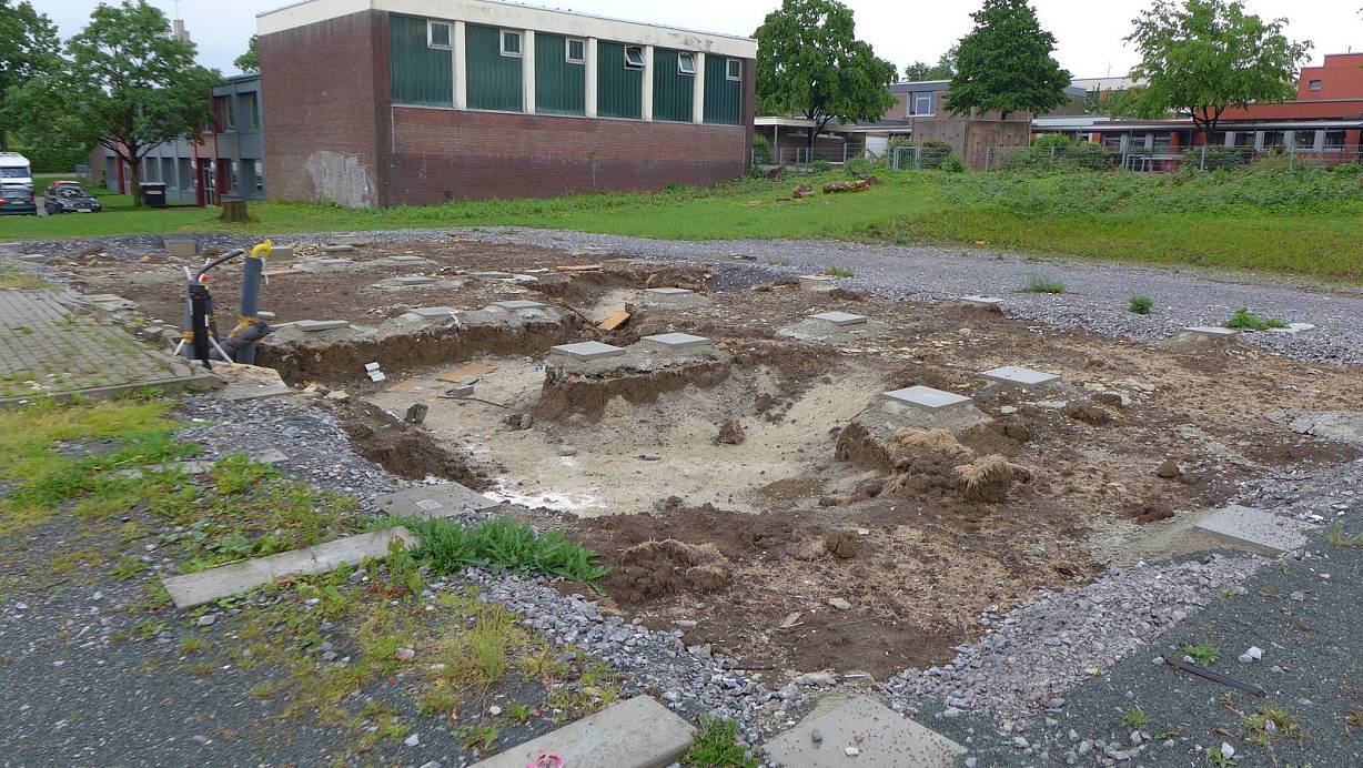 Die alte Gymnastikhalle wird ersetzt. Im Vordergrund die Reste des Fundaments der abgebauten Container. | © Hans-Hermann Igges