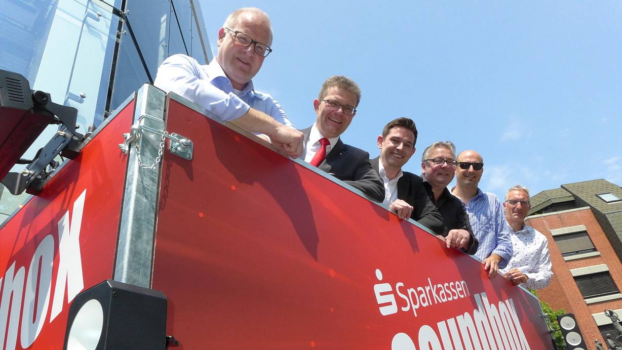 Gute Aussicht: Wolfgang Krenz (v. l.), Arndt Paas, Christian Lütkefedder, Matthias Vetter, DJ Mark Brain und Lothar Loewe freuen sich auf dem Soundbox-Wagen auf die Skatenights. | © Hans-Hermann Igges