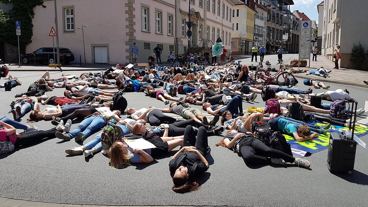 Die jungen Demonstranten liegen eine Minute lang still und regungslos auf dem Kreisel vor dem Kamp. | © Birger Berbüsse