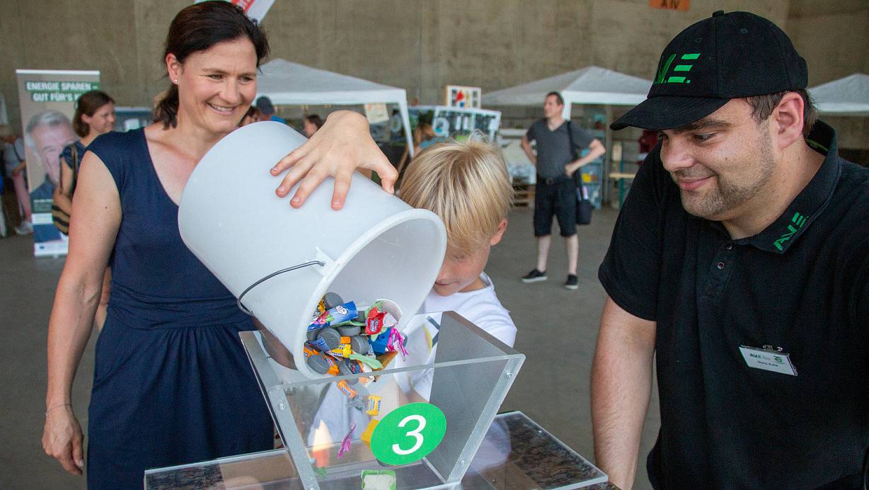 An einem weiteren Stand lernt der sechsjährige Justus, wie man alte Gläser zu Dekoartikeln umfunktioniert und ihnen so ein neuen Leben gibt. Mit Julius Hodders vom AVE bastelt er anschließend eine solarbetriebene Lampe, die im Deckel steckt und so den Inhalt des Glases beleuchtet – ganz im Sinne des Klimaschutzes, der beim AVE groß geschrieben wird.