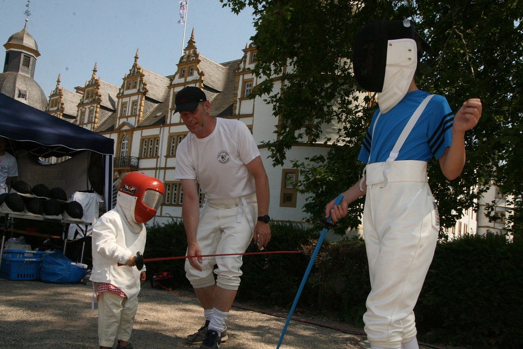 Einer davon war der SC Grün-Weiß Paderborn. André und Michaela Dawson präsentierten Modern Arnis. Bei der philippinischen Kampfkunst wird unter anderem mit 80 Zentimeter langen Rattanstöcken Selbstverteidigung gelernt. Der TSV Schloß Neuhaus war gleich mit mehreren Sportarten vertreten, unter anderem durfte Taekwon-Do ausprobiert werden. Der vierjährige Ludwig Koizar hatte beim TV 1875 Paderborn dagegen Interesse am Fechten. Sein Vater schaute begeistert zu.