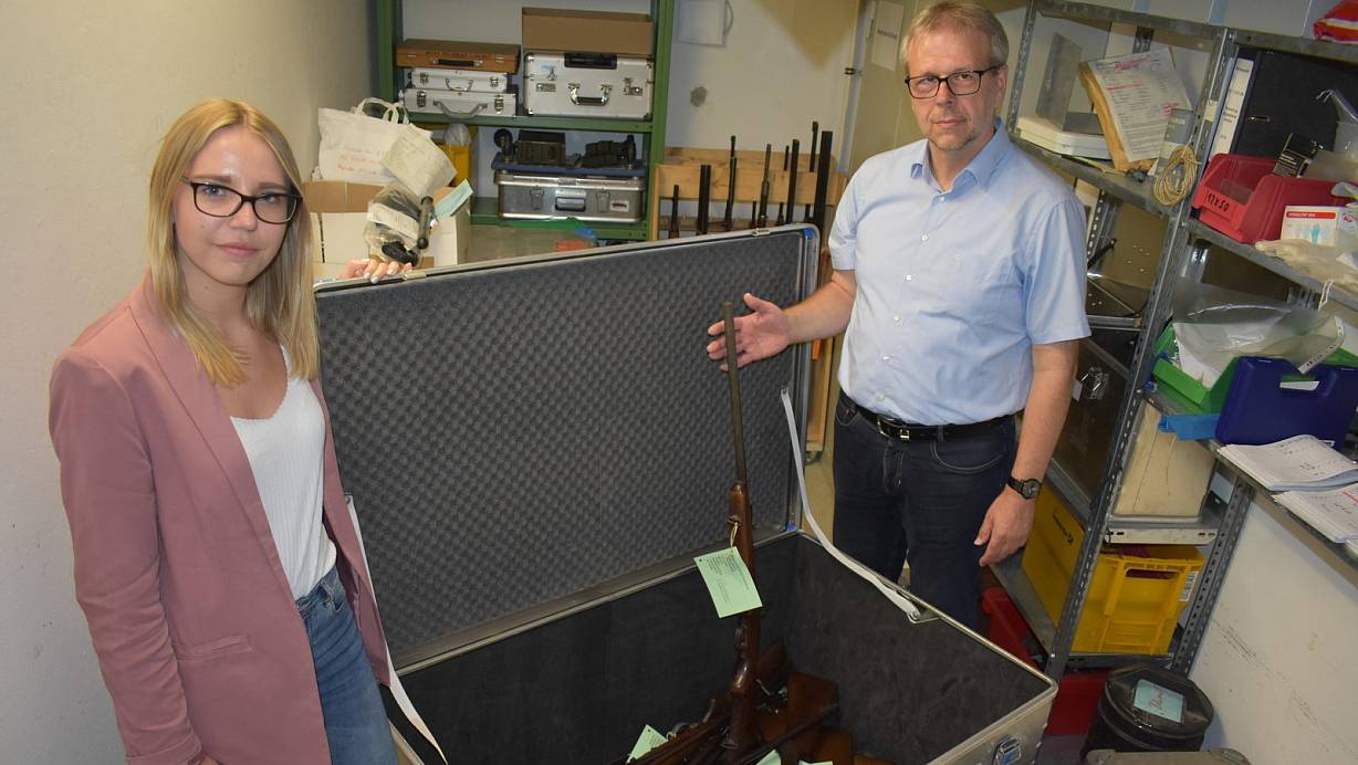Um die abgegebenen Gewehre und Pistolen kümmern sich Sachbearbeiterin Ines Fornefeld und Uwe Hansel, Leiter der Dierektion Zentrale Aufgaben. | © Svenja Ludwig