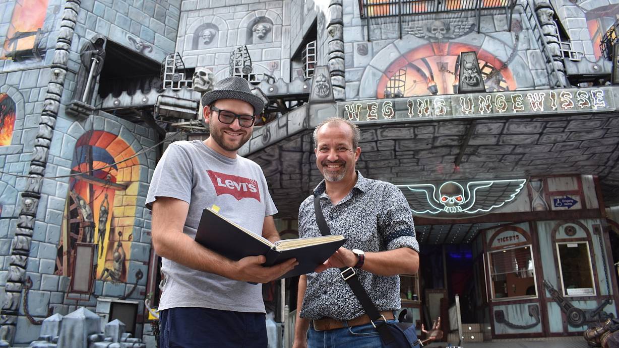 Blick in die Bücher: Bernd Rosenberger (r.) vom Bauordnungsamt kontrolliert die Geisterbahn Dämonium von Junior-Betreiber Marvin Blume. | © Svenja Ludwig