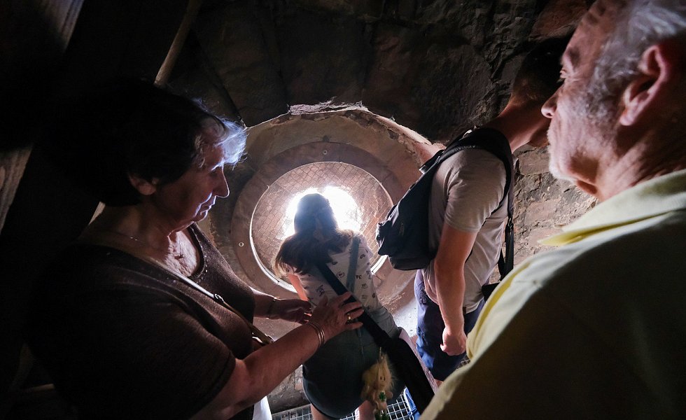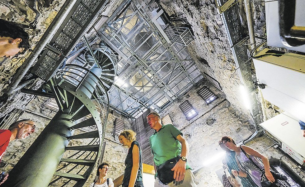 Im Gänsemarsch geht es für die nächste Gruppe dann die gewendelte Treppe hinauf. Es ist eng, etwas staubig, aber dafür angenehm kühl. Bis zu 15 Leute schleusen Norbert Liehr und Frank Deitelhoff während einer Führung durch den Turm.