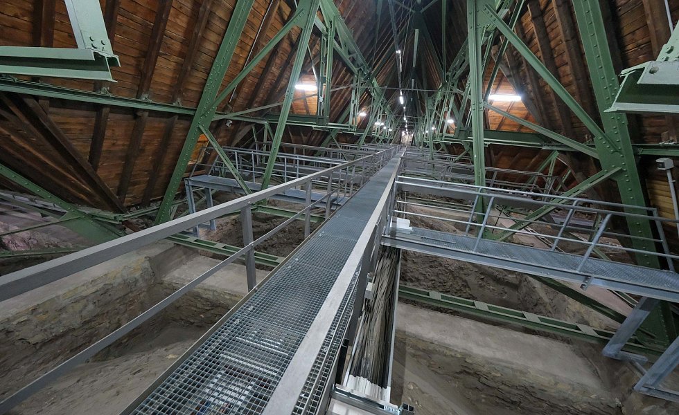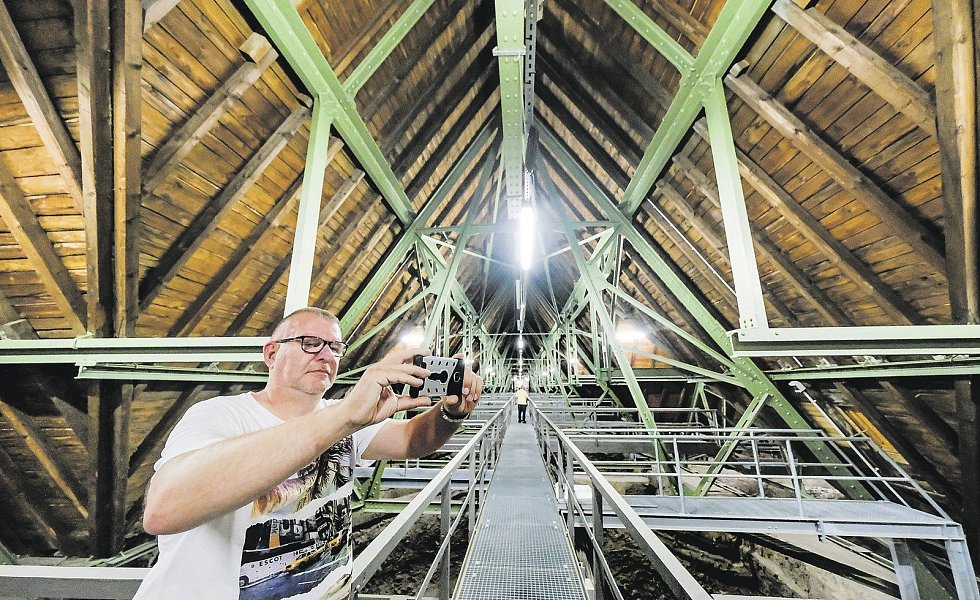 Im Anschluss führte Frank Deitelhoff die Besucher über eine Seitentür in das Dach der Bistumskirche. „Unter uns sehen wir das Kirchengewölbe von oben", erklärt er. Am Ende des Ganges konnten schwindelfreie Besucher einen Blick durch ein schmales Fenstergitter nach unten auf den Domplatz werfen.