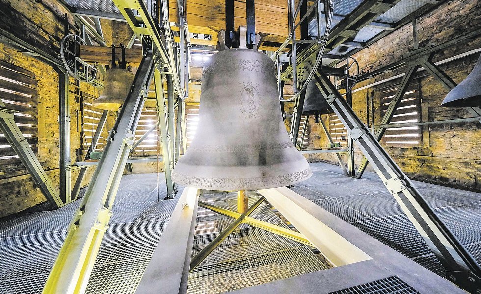 „Und wenn sie jetzt nach oben schauen, sehen sie die größte Glocke im Turm", weist Liehr die Besuchergruppe an. Dies sei die Jesus-Christus-Glocke, die ein stolzes Gewicht von 13.520 Kilogramm auf die Waage brächte. Oben drauf käme noch der Klöppel mit einem Gewicht von rund 500 Kilogramm.