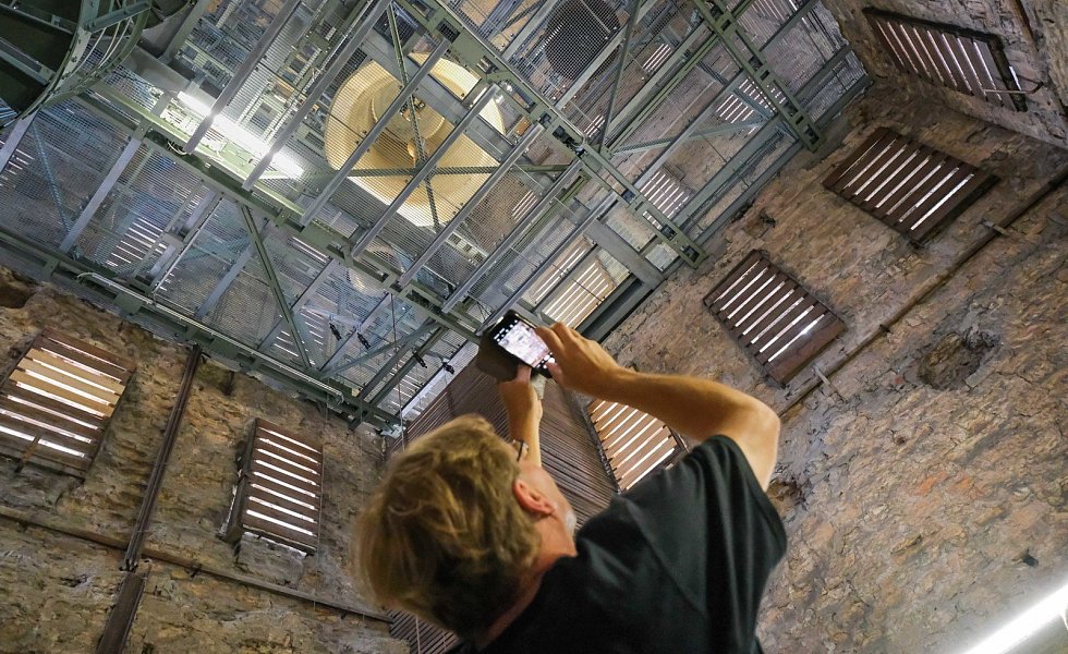 In der unteren Glockenstube angekommen, müssen viele Besucher erst einmal verschnaufen. Norbert Liehr jedoch, der zu dem Zeitpunkt bereits seine dritte Führung am Stück hinter sich gebracht hat, fängt direkt an zu erzählen. Die Zeit ist genau getaktet, unten warten schon die Nächsten.