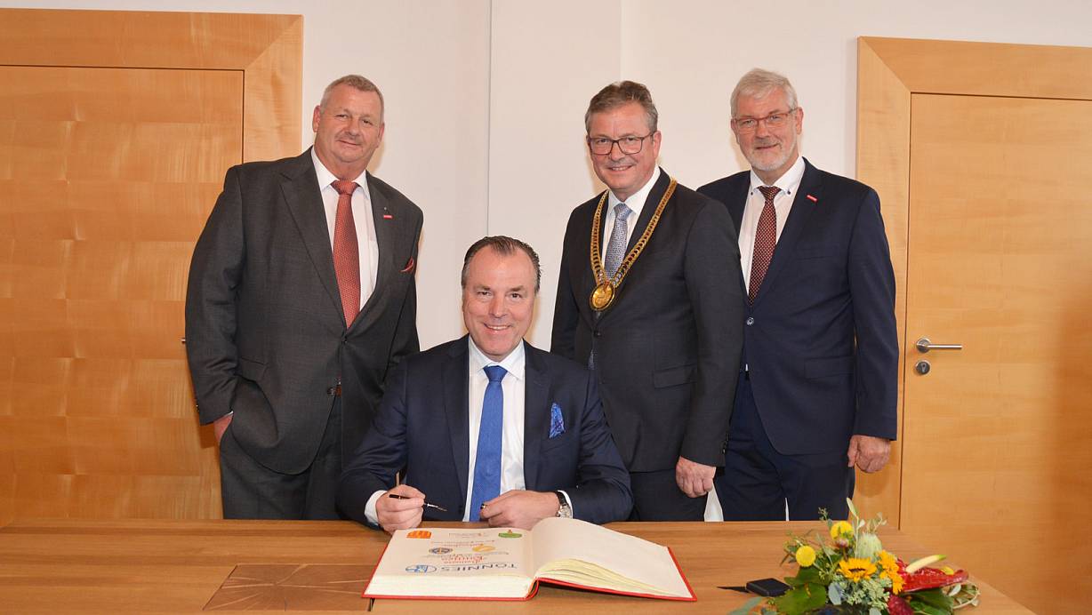 Da war die Welt noch in Ordnung: Kurz vor seinem Festvortrag durfte sich Clemens Tönnies in das Goldenen Buch der Stadt Paderborn eintragen. | © Stadt Paderborn