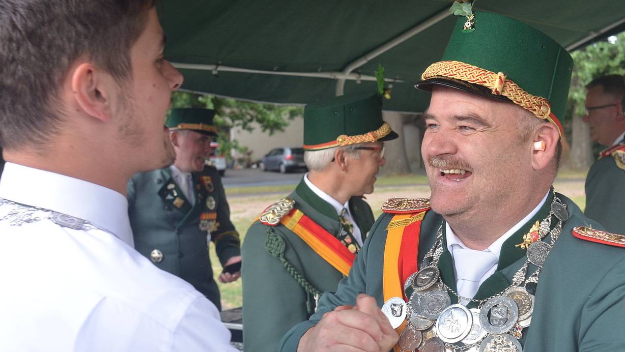 Den goldenen Treffer landete schließlich Bernd Petermeier. Der Benhausener erlegte den Vogel um exakt 18 Uhr mit dem 100. Schuss. In der Folge musste Petermeier zahlreiche Glückwünsche und Umarmungen über sich ergehen lassen. Der neue Bezirkskönig wird den Bezirksverband Paderborn-Stadt im kommenden Monat beim Schloß Neuhäuser Bundesfest vertreten. Bernd Petermeier darf zudem um die Würde des Diözesan- und Bundeskönigs schießen.