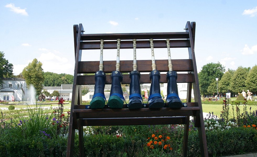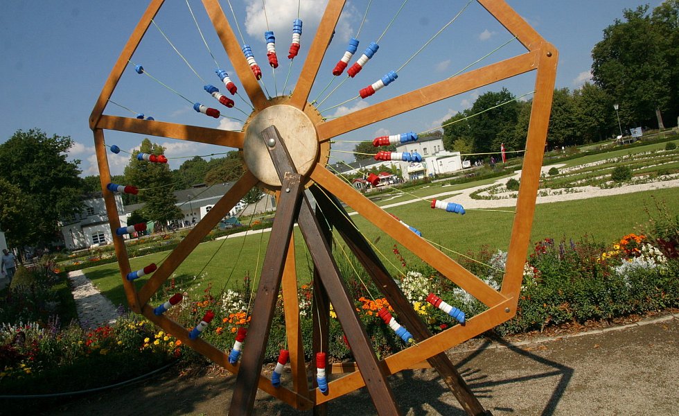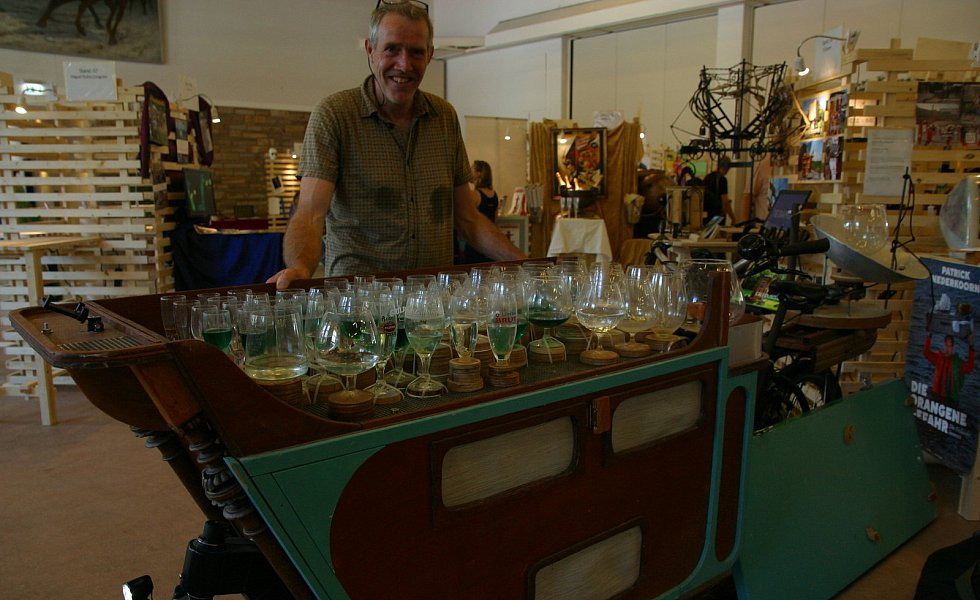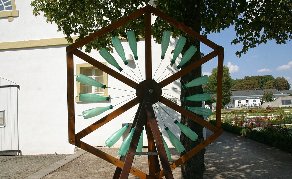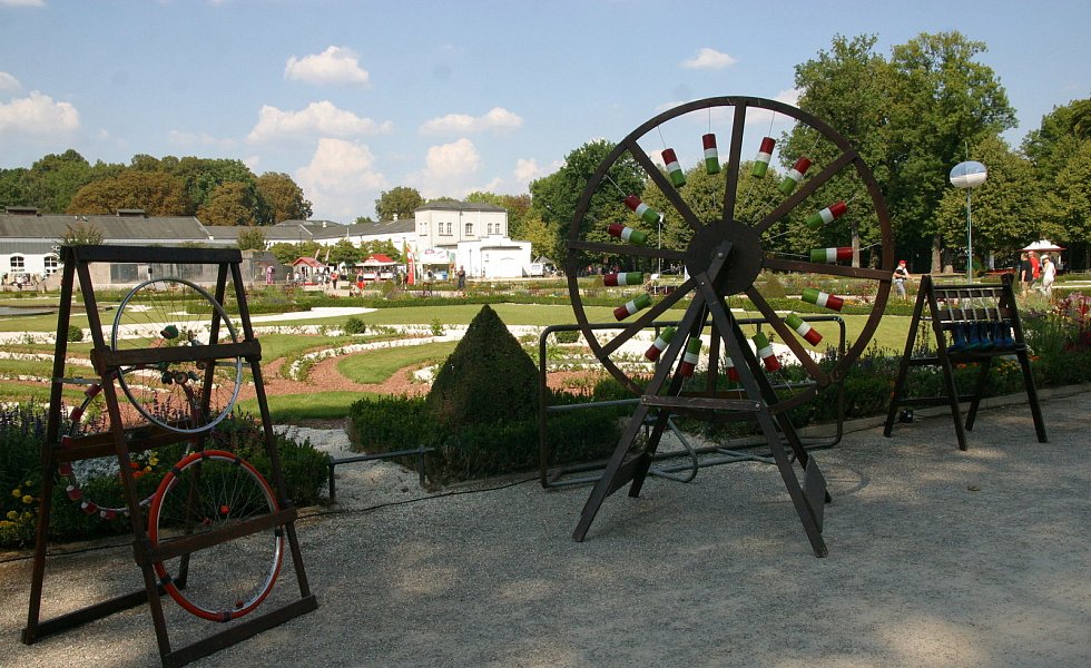 Die Darbietungen der Kleinkünstler reichen von artistischen Shows bis zu leiseren Darbietungen. Manches ist zum Mitmachen, manches nur zum Staunen, vieles hat eine tiefere Botschaft. So schwingt bei vielen Künstlern das Thema Nachhaltigkeit mit: Die Klanginstrumente von Etienne Favre, die Agenturinhaber Ralf Bachschmidt auf der Performance zeigt, bestehen komplett aus Recyclingmaterial. Alte Holzperlen und Filmröllchen tragen dazu bei, dass aus Bewegung Musik entsteht. Doch der Besucher lernt hier noch mehr: "Es geht auch um Entschleunigung", erklärt Bachschmidt, denn nur aus einer zu schnellen Bewegung entsteht ein schöner Ton.