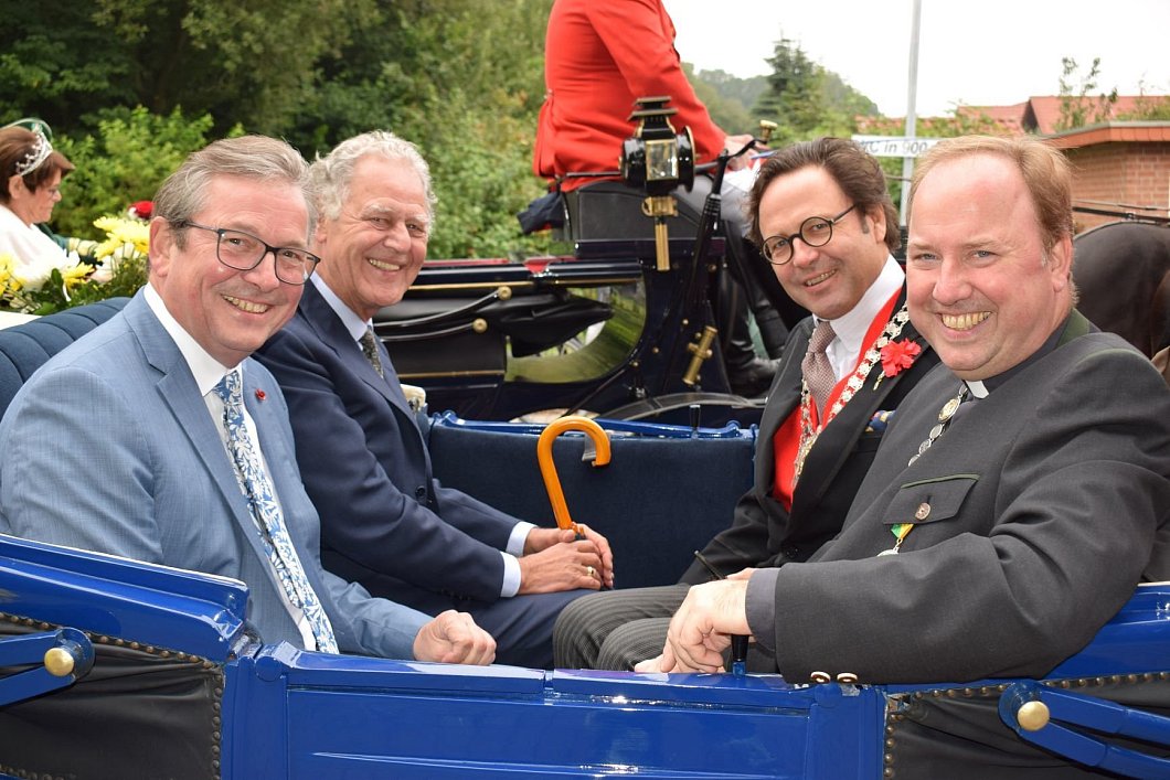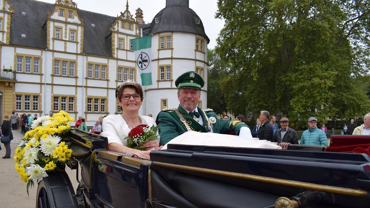 "Planen kann man so etwas nicht. 30 Prozent sind Können und 70 Prozent sind Glück. Ich hatte schon einmal 29 Ringe von möglichen 30. Damals hat es aber nicht für den Bundeskönig gereicht", stellt Lummer fest. Er ist bereits zum zweiten Mal König in Sudhagen und damit Kaiser und nun also auch Bundeskönig. An der Seite des 56-jährigen steht seine Frau Gaby "Ich war zu Hause, als ich die Nachricht erhielt. Wir waren schon einmal beim Bundesfest in Leverkusen dabei und konnten uns dort ansehen, wie groß das Ganze ist. Aber jetzt selber an erster Stelle zu stehen, ist schon etwas anders", sagt die neue Bundeskönigin. Ein Kleiderproblem hatte sie nicht. Ihr Königinnenkleid von 2018 war schnell zur Hand. Das cremeweiße Kleid strahlte mit dem neuen Königspaar bei der Kutschfahrt durch die Residenzstadt um die Wette. Neben Lummer wurde mit einem Ergebnis von 25 Ringen Benhausens Schützenkönig Bernd Petermeier Paderborner Diözesankönig.