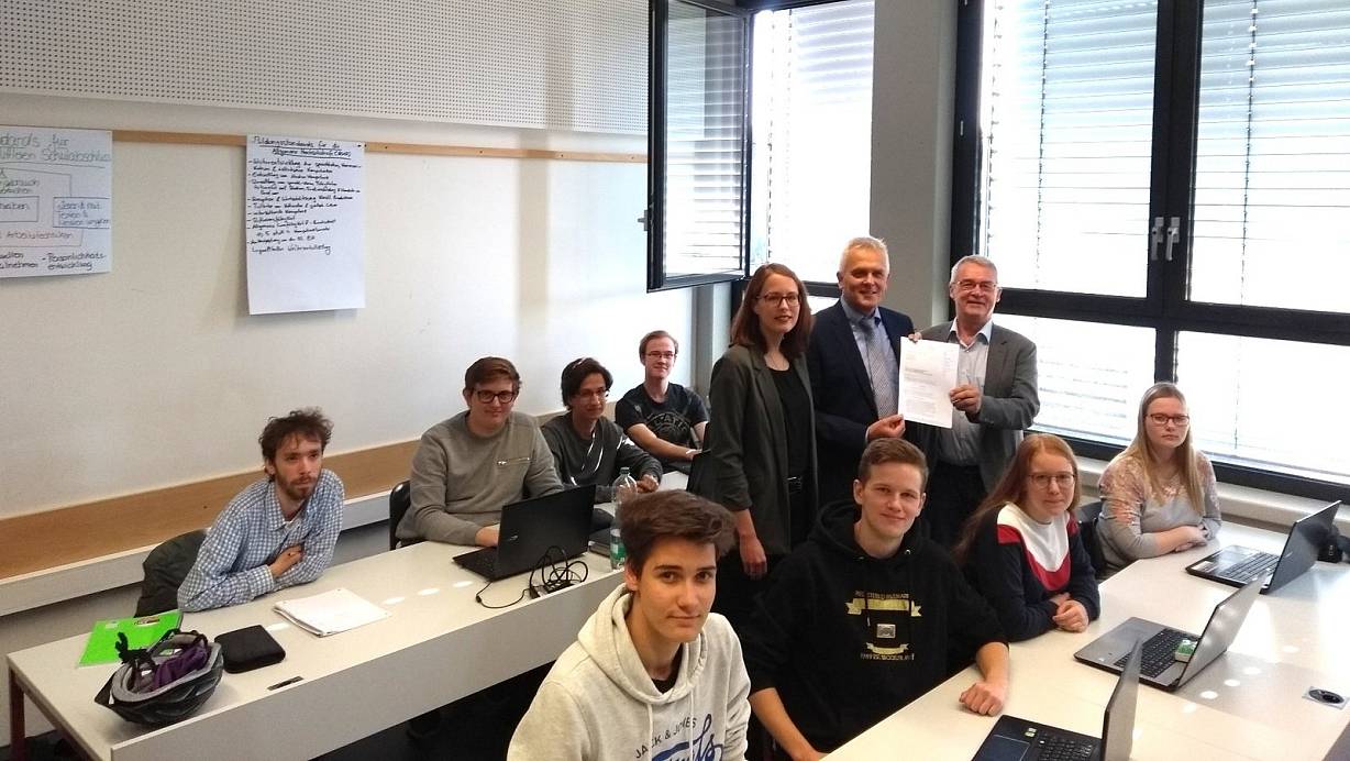 Zwischen den Schülern der 13. Klasse freuen sich Marie-Ann Kückman (v. l.), Matthias Groß und Burghard Lehmann über die Zusammenarbeit zwischen Stiftzung, Berufskolleg und Universität. | © Moritz Jülich