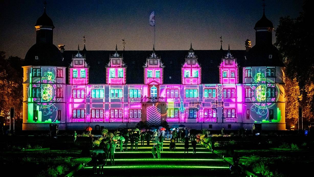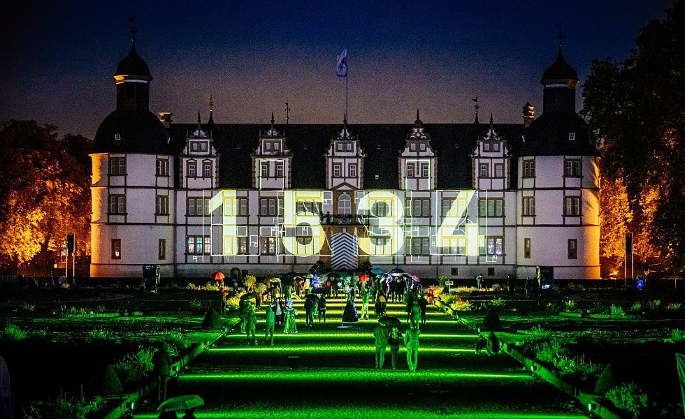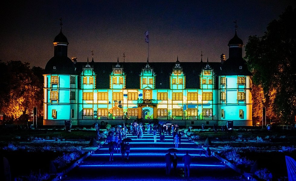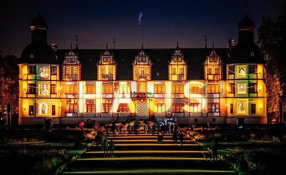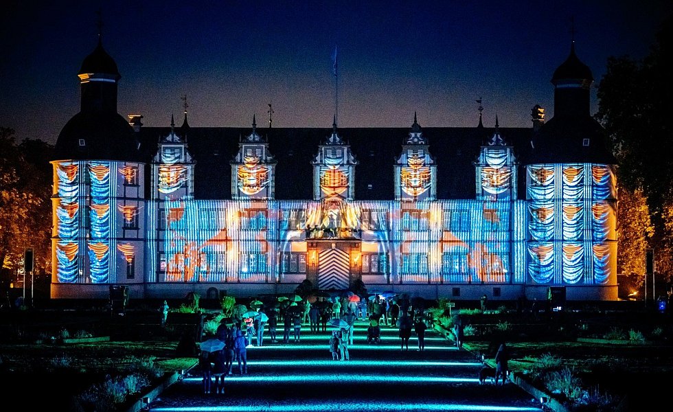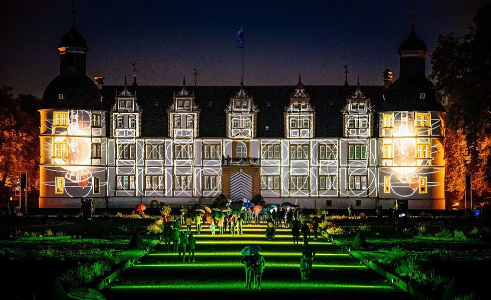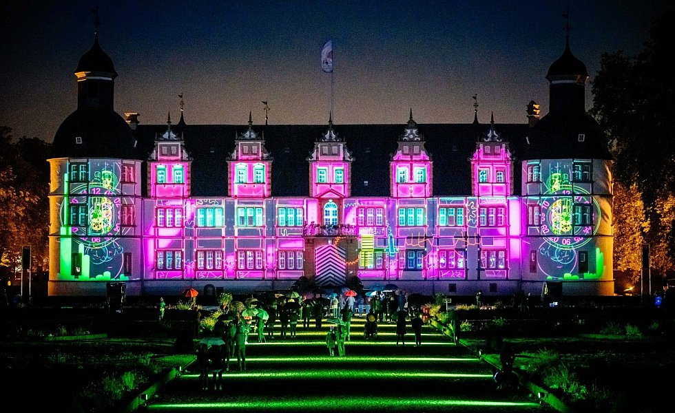Sechs Wochen haben Matthias Strobl und sein „The Night Lab"-Team aus Bielefeld an der Umsetzung des ersten großen Schloss-Leuchtens gefeilt: „Das Neuhäuser Schloss eignet sich bestens für diese Projektion. Es hat eine helle Fassade und vergleichsweise wenig Fensterfläche". Zwei große Beamer – zehnmal heller als die für den Privatgebrauch – verwandeln das Schloss schließlich in die „größte und schönste Leinwand der Region", wie Christian Stork, Geschäftsführer der Schlosspark- und Lippesee-Gesellschaft, bereits vorab versprochen hat.