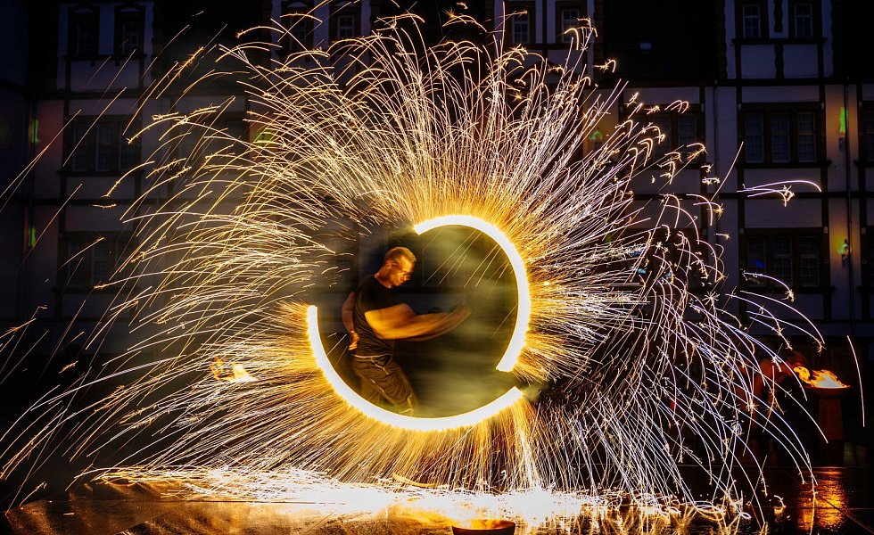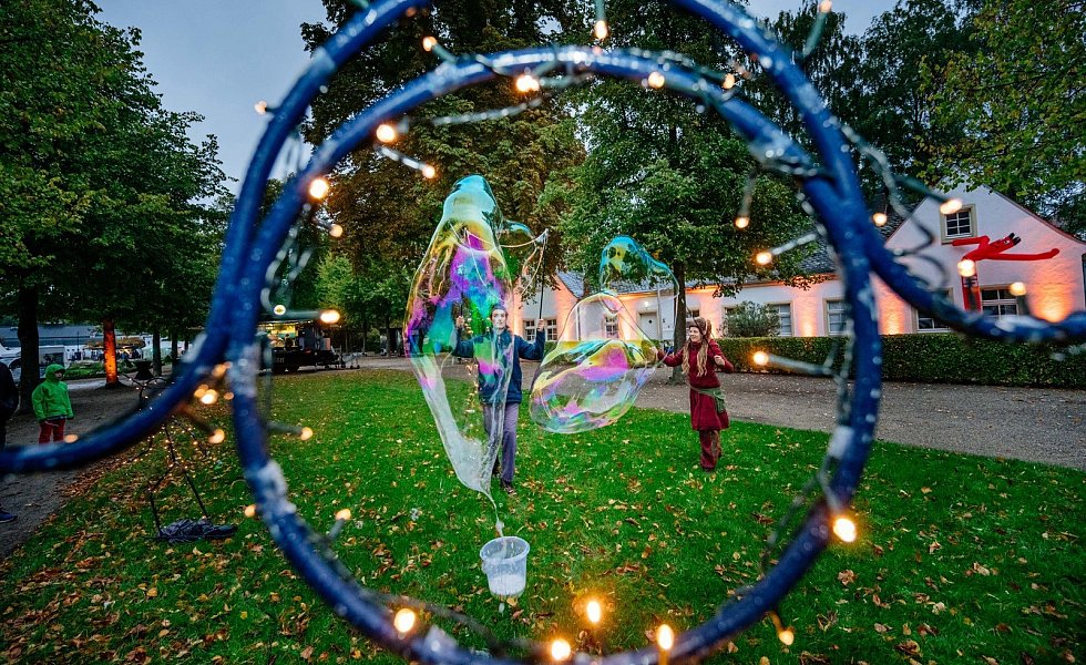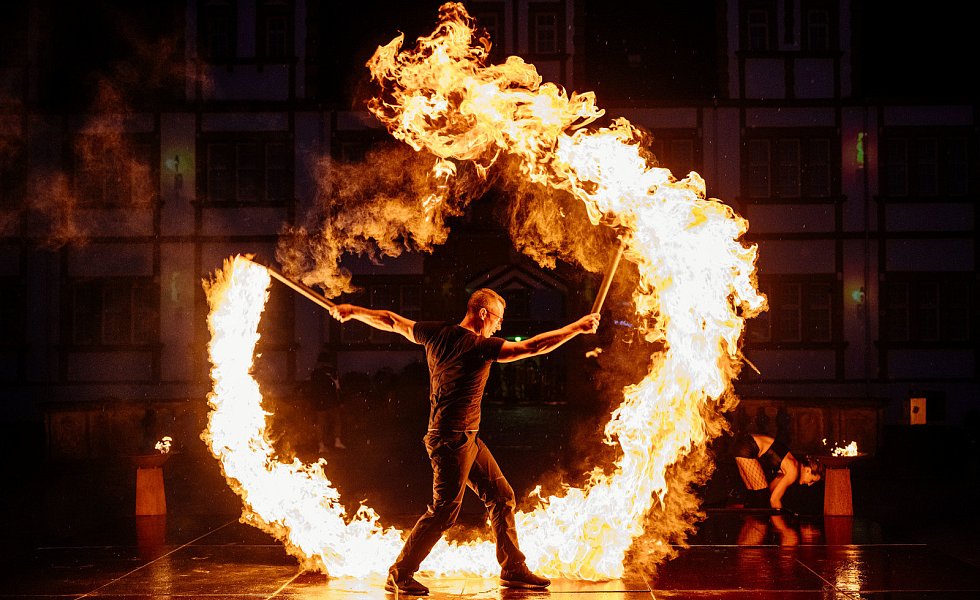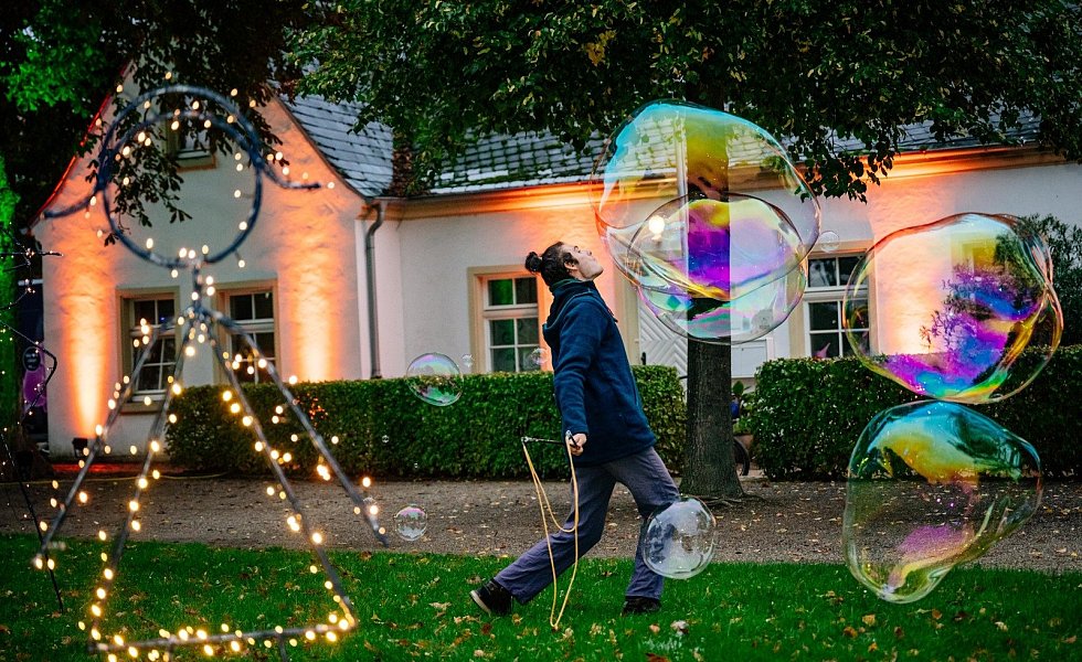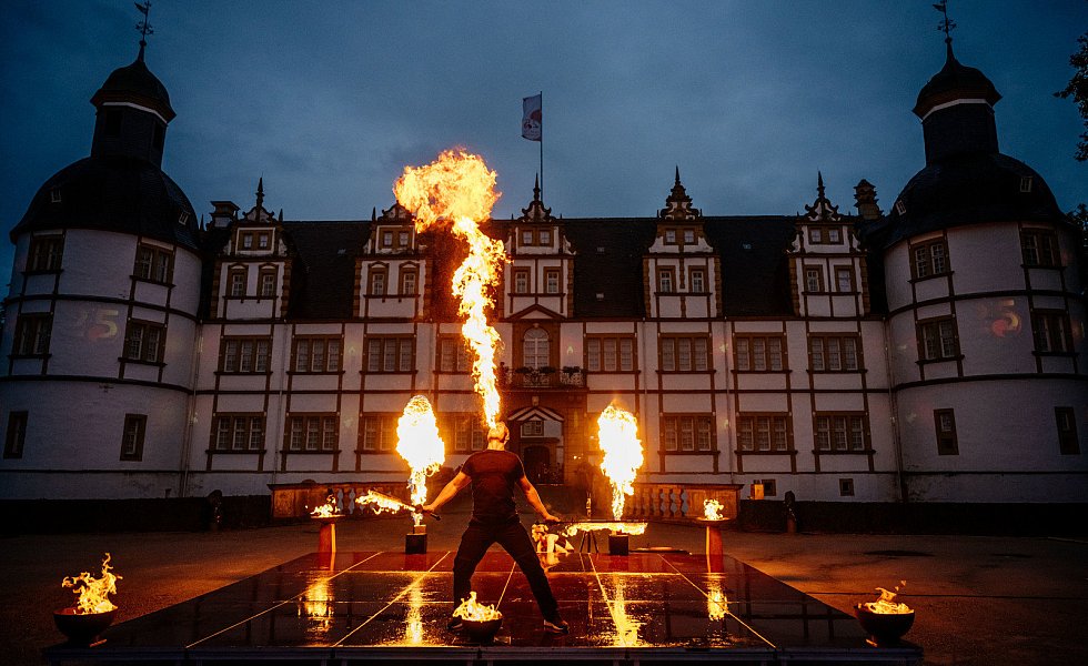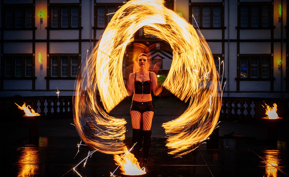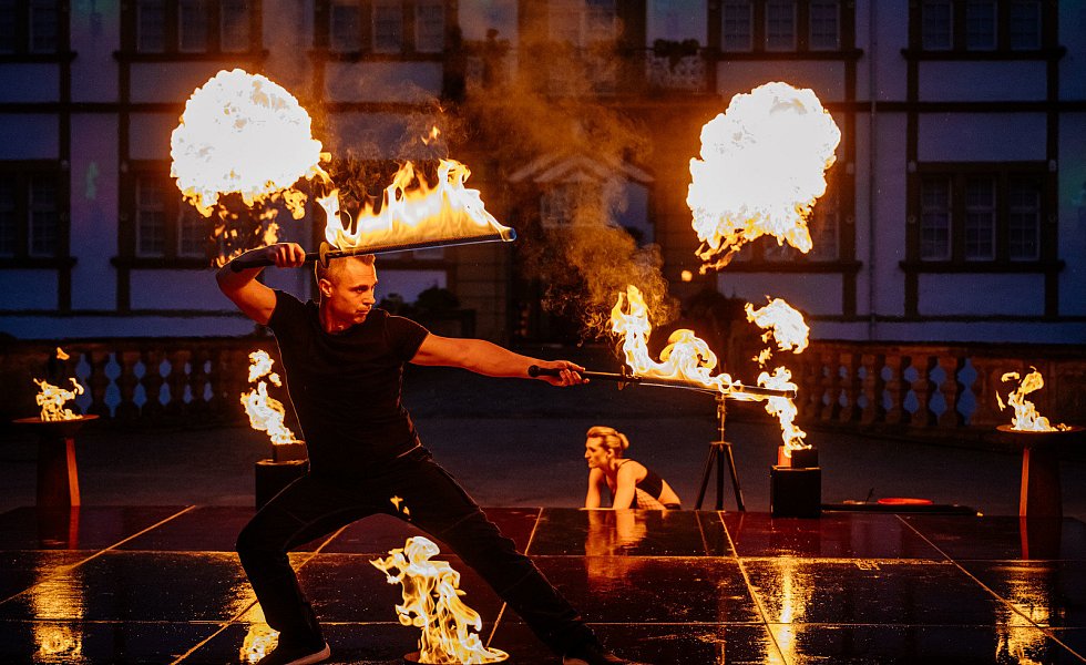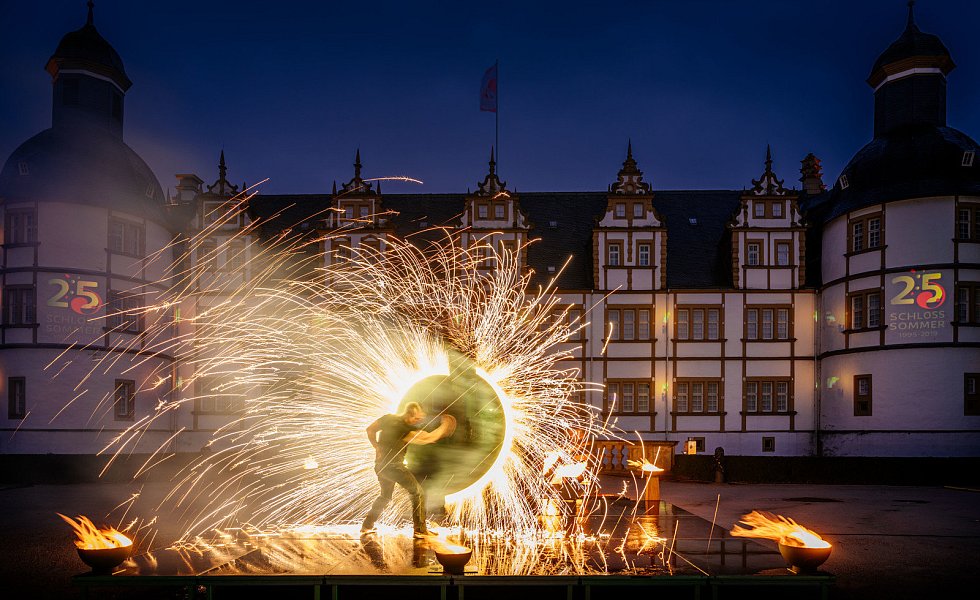 Neben Farben, Formen, Wappen, Effekten und Bildern auf der Fassade sorgen zum Abschluss des 25. Schloss-Sommers die Feuerjonglage mit Fächern, Fackeln und Flammenwerfen des Teams „Feuer und Bewegung", die riesigen Seifenblasen des „Bubble-Zauber"-Teams sowie „Die Beleuchter" für staunende Blicke bei Groß und Klein. Der fantastisch poetische Walk-Act erhellt neben hunderten Lampen und zahlreichen Projektoren, die die Architektur des Schlosses hervorheben, das Dunkel mit Laternen, Miniaturwelten aus Licht und ruhiger Musik, bevor der zweite Höhepunkt des Abends übernimmt.