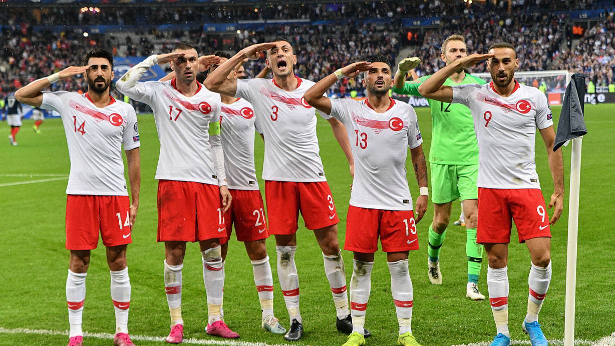 Spieler der türkischen Nationalmannschaft salutieren nach dem Torjubel. Der Vorsitzende des Paderborner Integrationsrates verteidigt das.  | © picture alliance