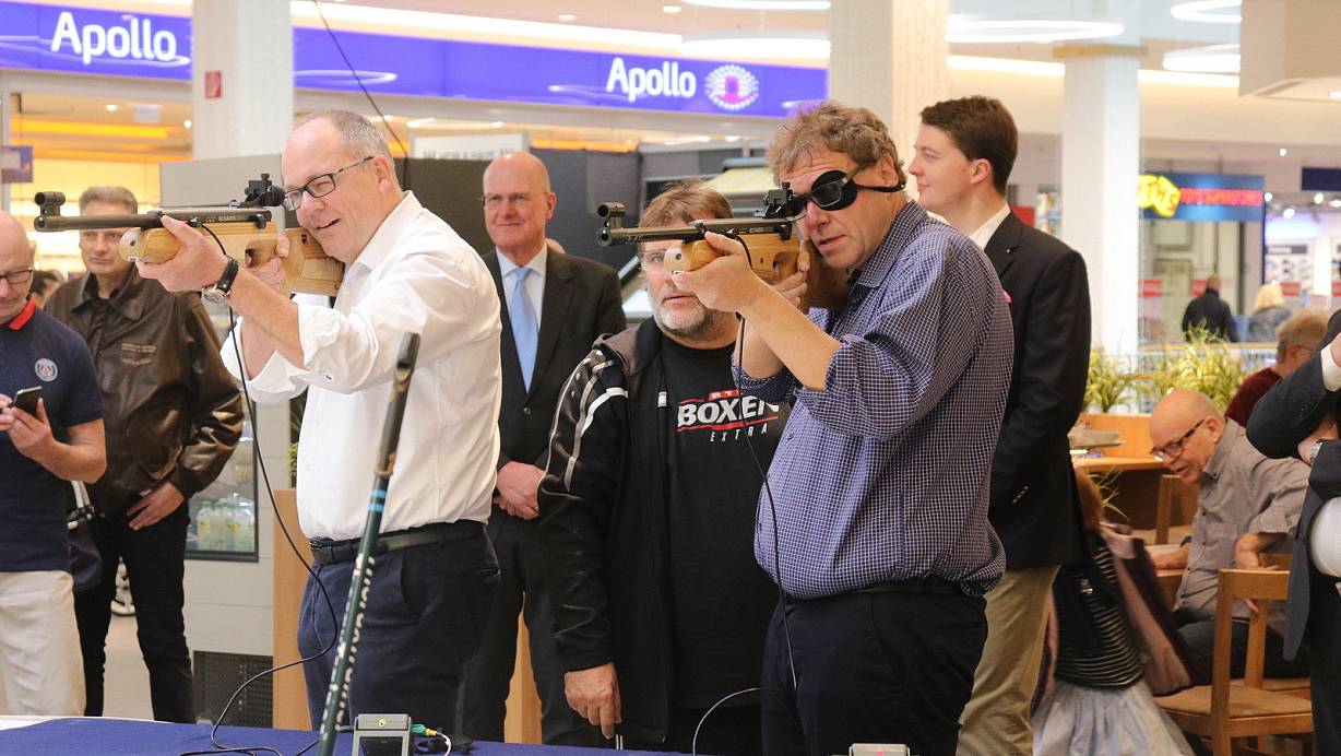 Augenklappe: (v.l.) Uwe Seidel und Markus Mertens am Schießstand, im Hintergrund beobachtet Friedrich Klingenthal den Wettkampf. | © Marc Schröder