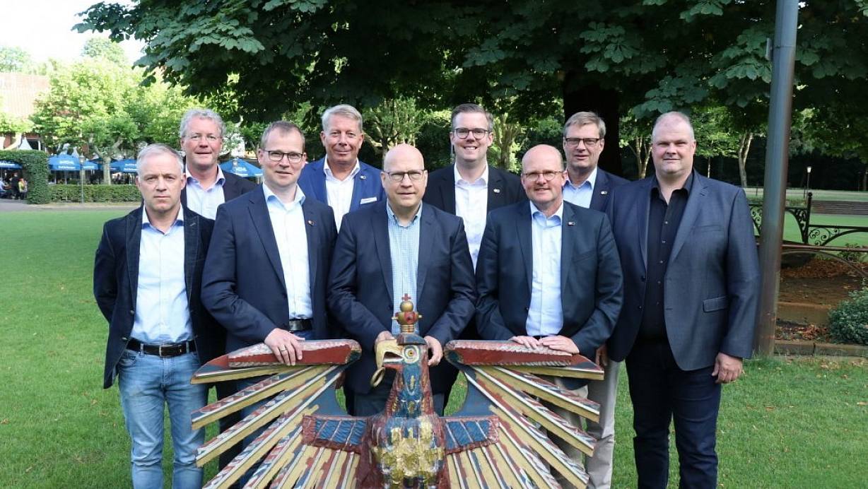 Die Spitze des PBSV: Rüdiger Uhle (v.l.), Peter Disselnmeyer, Schützenkönig Ralf Brinkmann, Jürgen Lutter, Frank Langenhorst, Thomas Spieker, Bernd Zengerling und Christian Lüke. | © Birger Berbüsse