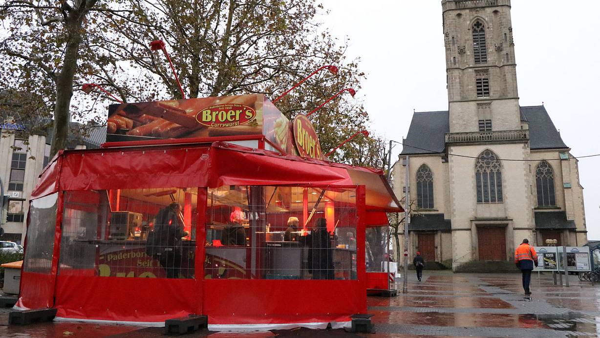 Während des Paderborner Weihnachtsmarkts steht der Würtschen-Stand vor der Herz-Jesu-Kirche.