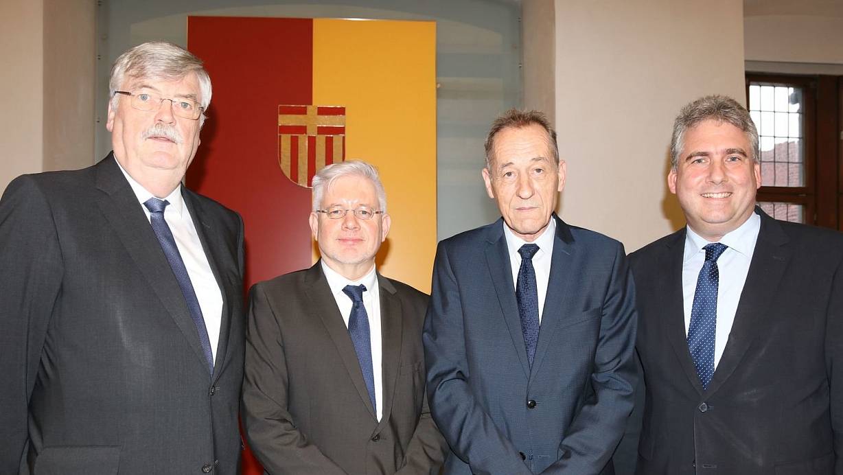 Der Präsident des Oberlandesgerichts Hamm, Johannes Keders (v. l.), begrüßte im Paderborner Rathaussaal den neuen Leiter des heimischen Landgerichts Michael Haas, dessen Vorgänger Klemens Thiemann sowie Staatssekretär Dirk Wedel. | © Jutta Steinmetz