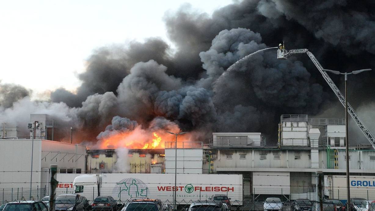 Der Westfleisch-Schlachthof wird bei dem Großbrand im Februar 2016 völlig zerstört. | © Marc Köppelmann