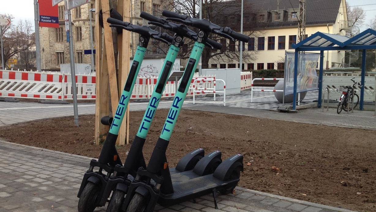 Die E-Tretroller von Tier gibt es jetzt auch in Paderborn. Seit 6 Uhr stehen sie unter anderem am Kasseler Tor. | © Holger Kosbab