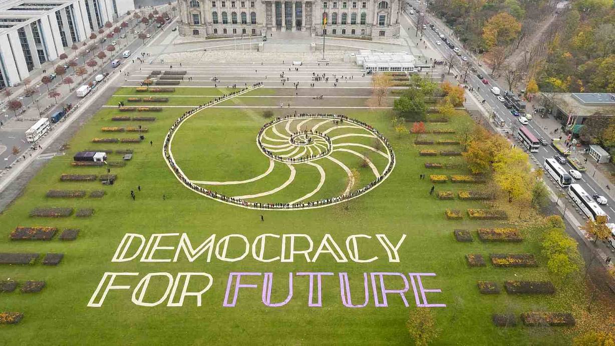 Der Bürgerrat hat sich vorm Reichstagsgebäude in Berlin als Schnecke formiert.  | © Bürgerrat Demokratie
