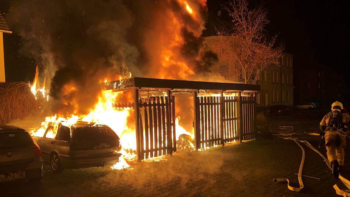 Das Feuer, bei dem an der Bleichstraße ein Carport, drei Autos und die Fassade eines Mehrfamilienhauses beschädigt wurden, sei auf den unsachgemäßen Umgang mit Feuerwerkskörpern zurückzuführen. Die Flammen griffen von einem Müllbehälter auf das Carport und schließlich die Autos über. Der Sachschaden liegt bei etwa 35.000 Euro.
