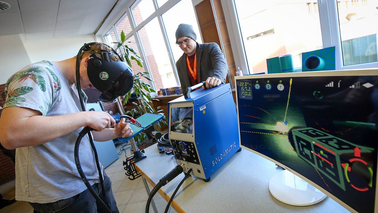 Metallbauer Patrick Ringkamp schweißt mit der VR-Brille, Gilbert Kwirant von der SBH West schaut zu. | © Niklas Tüns