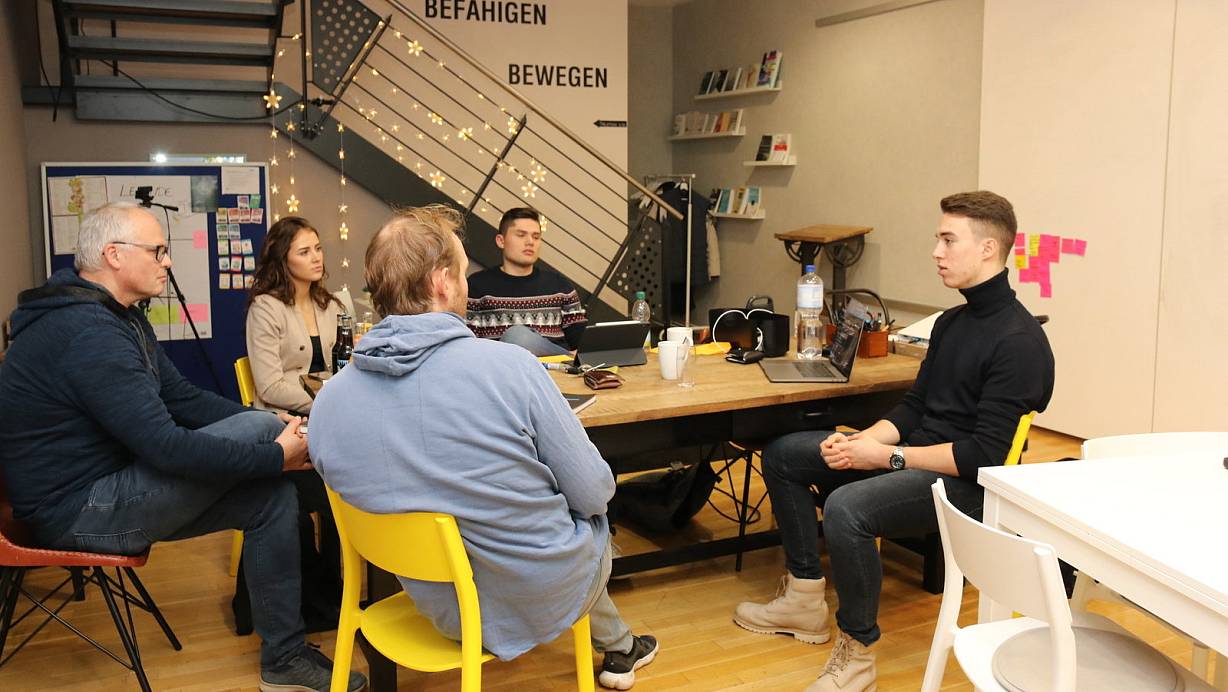 Hans Norbert Blome (v. l.), Vanessa Rais, Dennis Kehne, Nils Blome und Hannes Ill sitzen im Besprechungsraum und arbeiten an einem Gesundheitsprojekt.  | © Mareike Gröneweg