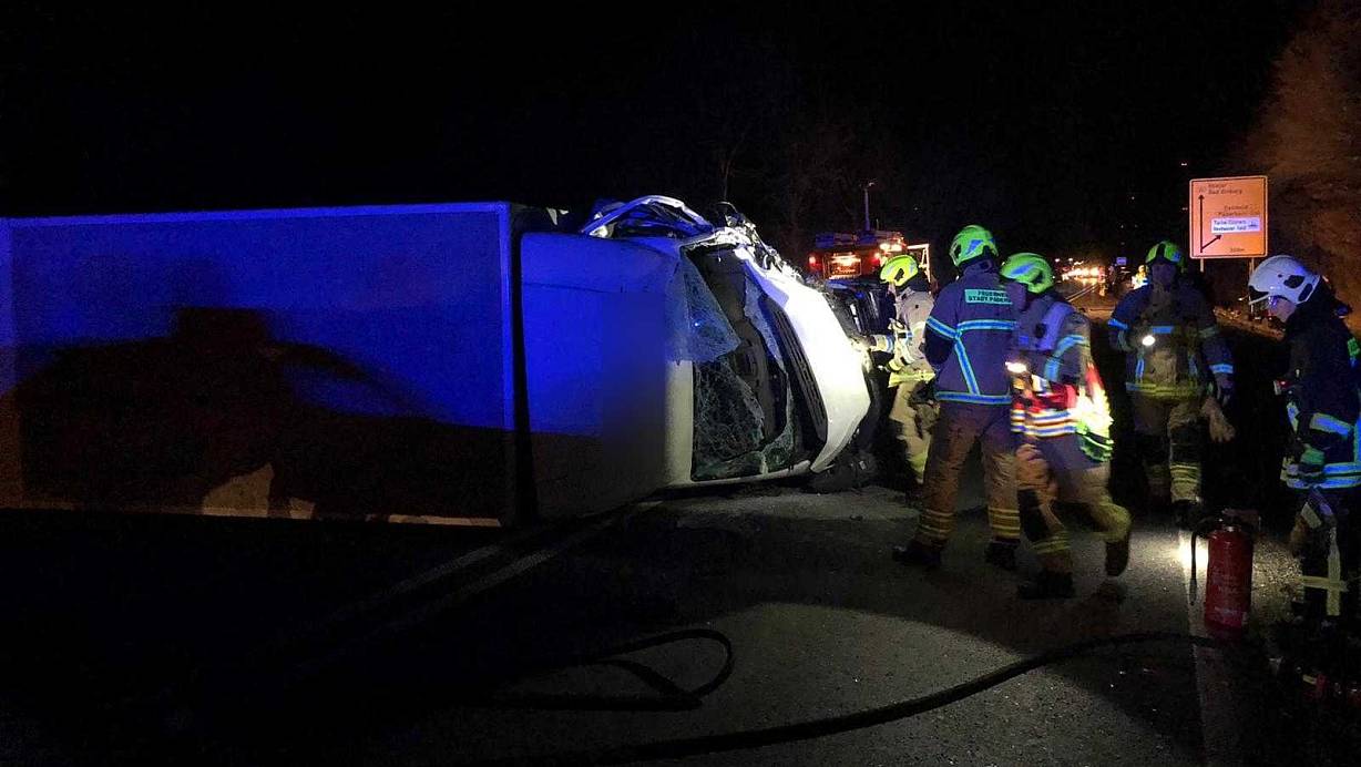 Ein Kleinlaster geriet aus unbekannten Gründen auf die Gegenfahrbahn und stieß dort mit einem Auto zusammen.