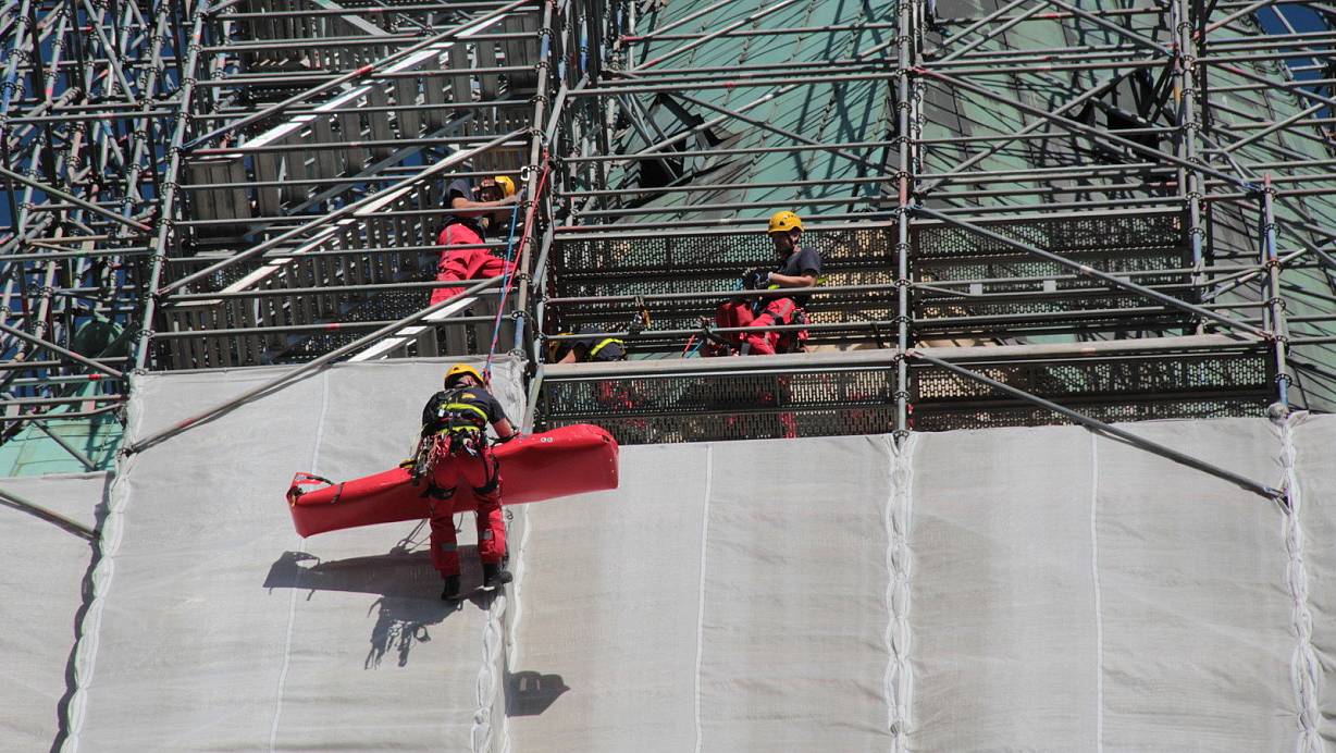 Ende 2018 simulieren die Höhenretter das Abseilen eines verletzten Arbeiters vom Gerüst, das damals noch den Turm einhüllt. | © Marco Schreiber