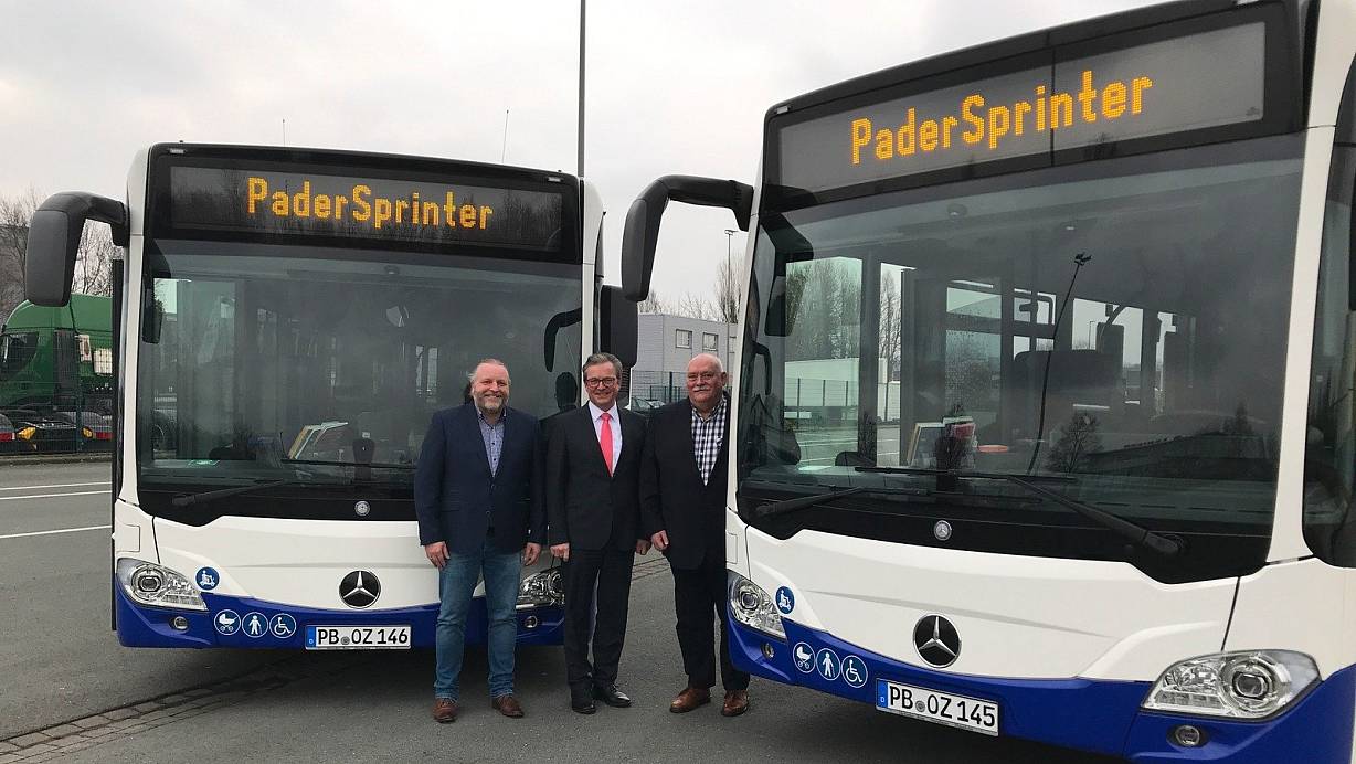 Paderborn. Elf fabrikneue Linienbusse vom Typ ”Mercedes-Benz Citaro” verstärken jetzt die Flotte des Padersprinters und der 100-prozentigen Tochter, der Kraftverkehrsgesellschaft Paderborn. Die neuen 18 Meter langen Gelenkbusse mit vier Türen entsprechen, wie schon die Neuanschaffungen der letzten Jahre, der aktuell höchsten Euro-VI-Abgasnorm und verfügen über eine moderne Abgasnachbehandlung. Durch die Beachtung weiterer Kriterien, wie niedrige Geräuschpegel und umweltschonende Lacke, werden auch diese Busse mit dem Siegel für besondere Umweltverträglichkeit unterwegs sein: dem „Blauen Engel".