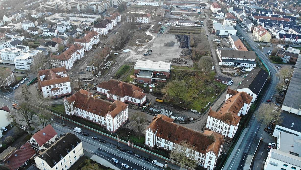 Die Abrissarbeiten auf dem Gelände der ehemaligen Alanbrooke-Kaserne schreiten fort, wie ein Blick aus der Vogelperspektive zeigt. | © Jens Reddeker