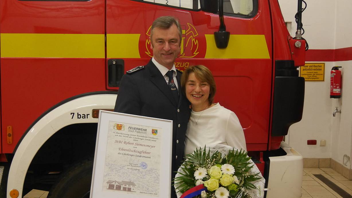 Sichtlich emotional bewegt, bedankte sich der scheidende Löschzugführer bei seinen Kameraden für das ausgesprochen gute Klima und das harmonische Miteinander. „Wir können stolz auf unser Wirken sein, ich weiß den Löschzug Sande auch künftig in guten Händen", so Siemensmeyer. Als besondere Überraschung hatten die Sander Kameraden für ihren langjährigen Löschzugführer und seine Frau Sonja ein Präsent vorbereitet: Eine Reise nach Wien.