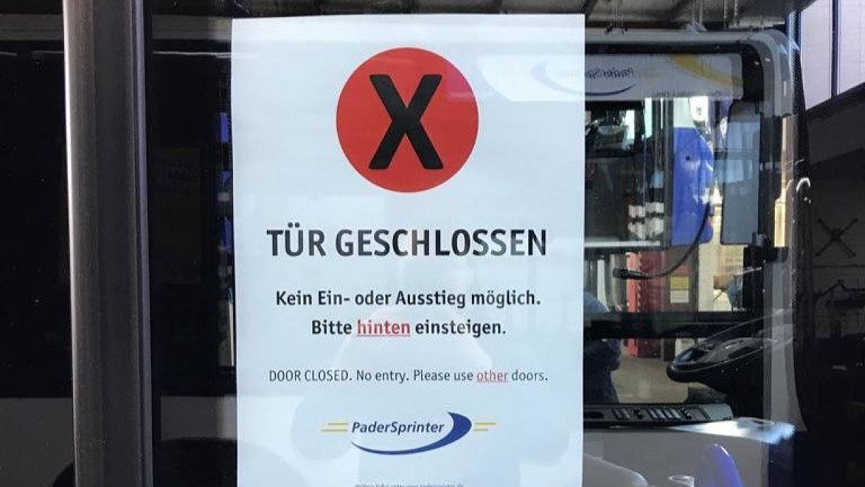 Bis auf Weiteres wird der Vordereinstieg bei allen Bussen in den Kreisen Paderborn und Höxter gesperrt, der Fahrerbereich wird mit rot-weißem Absperrband provisorisch vom Fahrgastinnenraum getrennt. Ein Hinweisschild vor der ersten Sitzreihe und an der Außentür informiert die Fahrgäste. Der Ein- und Ausstieg erfolgt dann über die zweite bis vierte Fahrzeugtür.