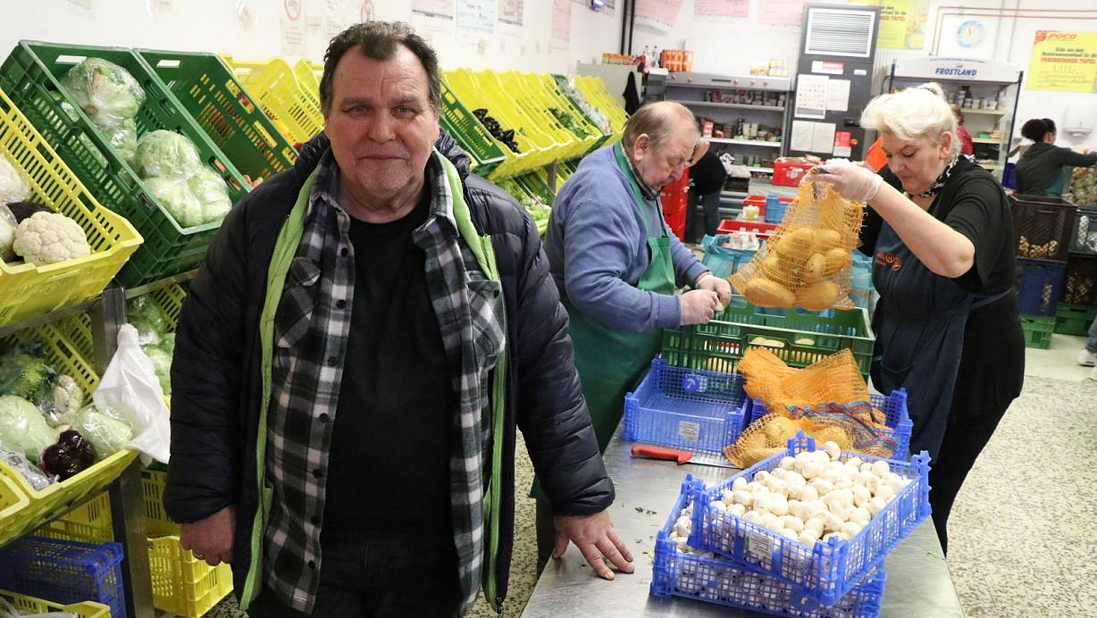 Der Tafel-Geschäftsführer Wolfgang Hildesheim (v. l.) hat kaum noch Waren, die er ausgeben kann und die seine Mitarbeiter wie Peter Koke und Gaby Kirchhoff für bedürftige Menschen vorbereiten. | © Holger Kosbab