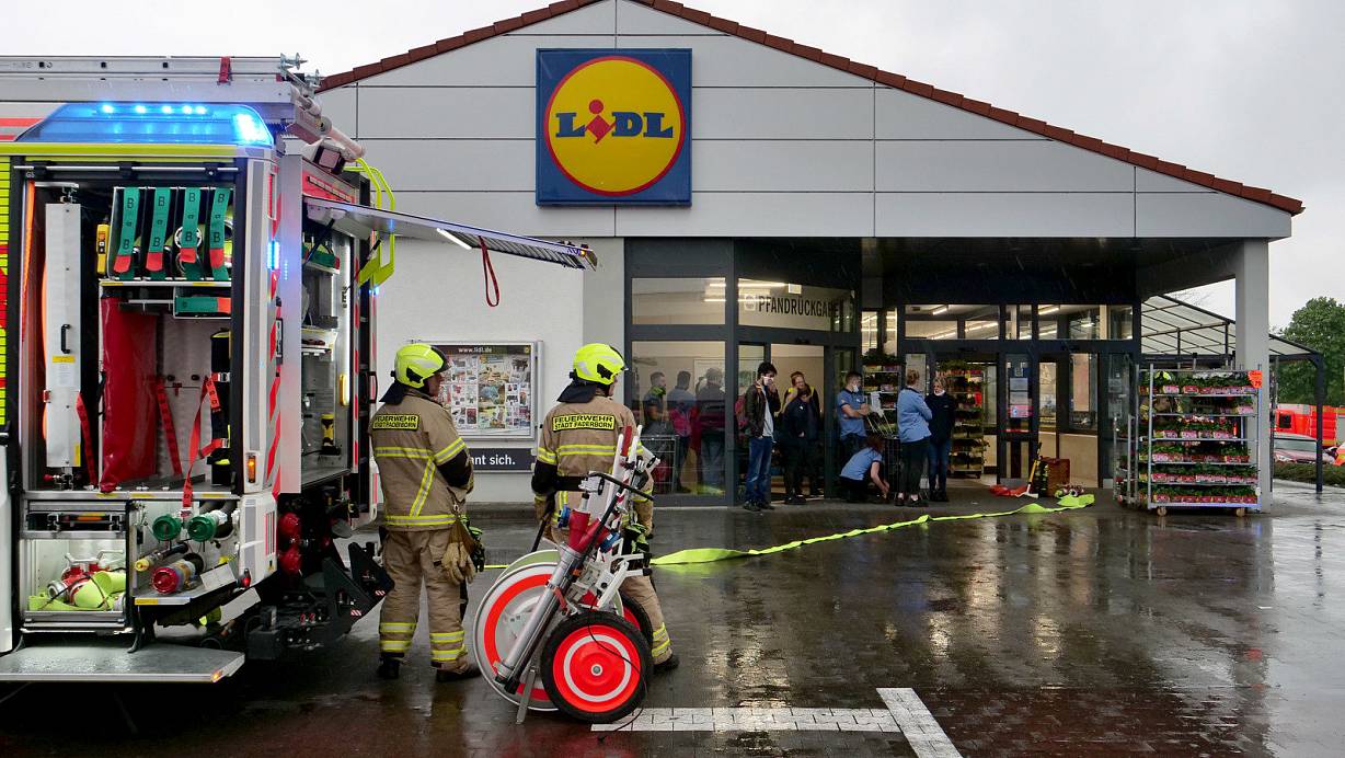 Rund 45 Feuerwehrleute überprüfen am frühen Samstagmorgen eine Lidl-Filiale an der Warburger Straße.