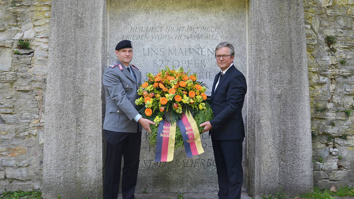 Bürgermeister Michael Dreier (r.) und Oberstleutnant Jörg Stenzel legen zum 75. Jahrestag am Mahnmal Busdorfwall einen Kranz nieder. | © Stadt Paderborn