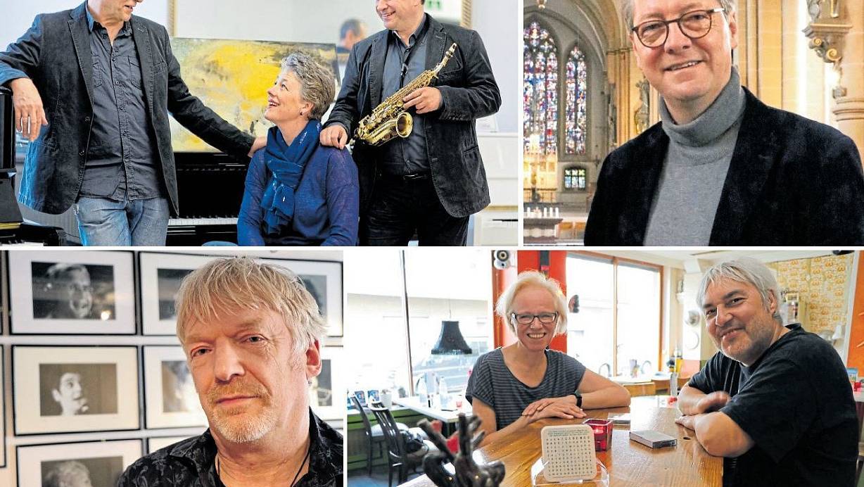 Uli Lettermann (mit Saxofon) mit den den Mit-Initiatoren und Unterstützern (von links oben im Uhrzeigersinn) Rainer Schallenberg (Jazzclub), Petra Lettermann, Domkapellmeister Thomas Berning, Simone Schneider und Adda Schade (Sputnik) sowie Kabarettveranstalter Carsten Hormes. | © Fotos: Kosbab (3), Lettermann / Montage: NW