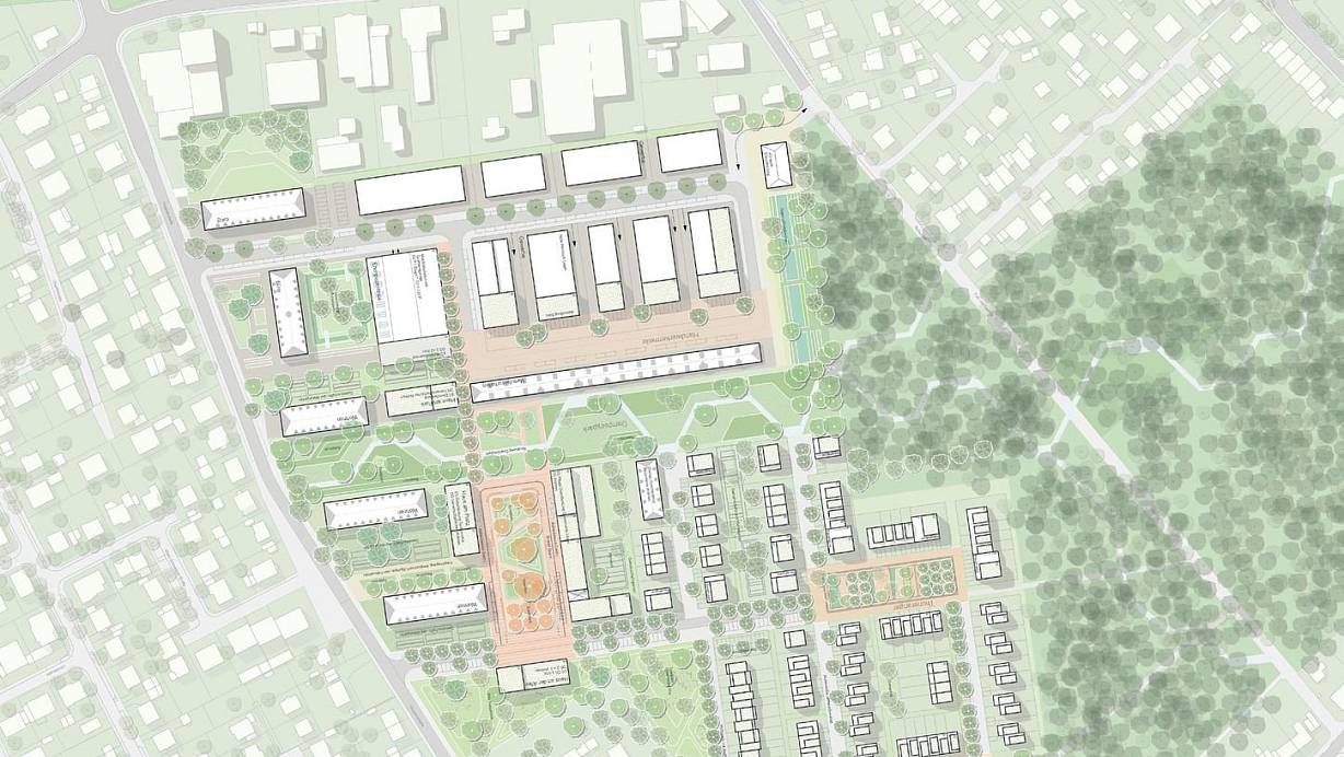 Im Westen des ehemaligen Kasernengeländes im Bereich Dubelohstraße (oben) ist kleinteiliges Gewerbe geplant, im Osten die Wohnbebauung und im südlichen Bereich ein großer öffentlicher Platz.  | © Tobe.Stadtbüro/AP Landschaftsarchitekten